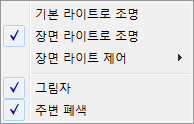 뷰포트의 조명 및 그림자 미리 보기에 대한 옵션이 포함된 하위 메뉴를 표시합니다. 자세한 내용은 아래를 참조하십시오.