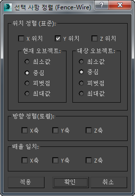 복제본 위치 정렬 기준으로 사용할 축을 지정합니다. 세 옵션을 모두 설정하면 선택 오브젝트가 대상 오브젝트의 위치로 이동합니다.