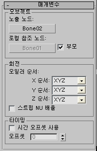 다음 설정을 통해 노출된 노드, 상위 이외에 참조된 오브젝트, 회전 및 타이밍 매개변수를 지정할 수 있습니다.