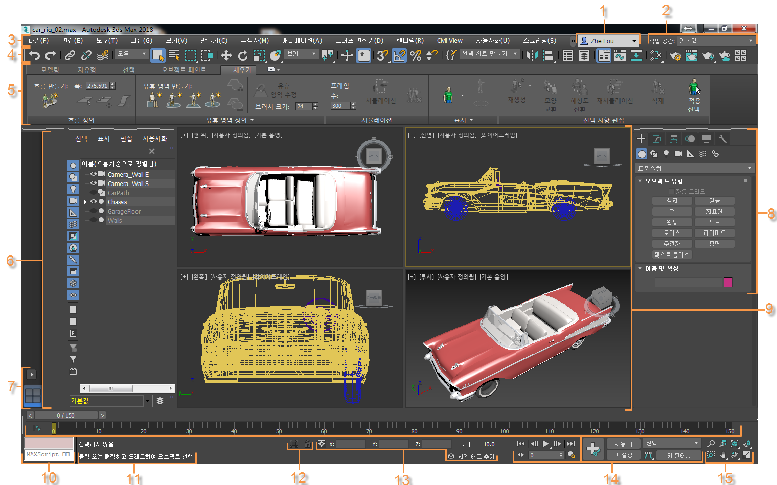 3ds Max 인터페이스는 컨트롤, 상태 정보 및 장면을 보고 작업하는 뷰포트로 구성됩니다.