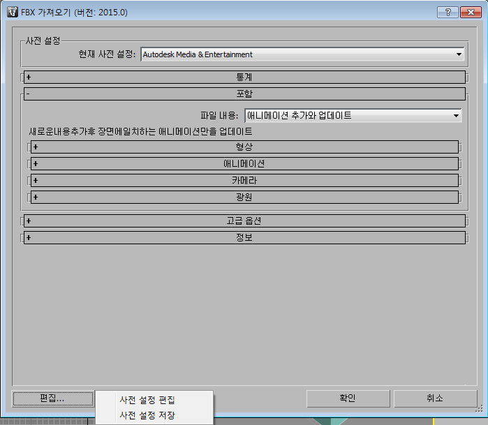 3ds Max FBX plug-in에서는 사용자 정의 사전 설정을 파일에 저장하므로 다른 사용자와 공유할 수 있습니다. 자세한 내용은 사전 설정 저장을 참조하십시오.