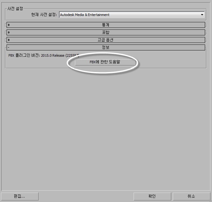 정보 롤아웃에서 FBX의 도움말 버튼을 클릭하여 3ds Max FBX plug-in 문서에 액세스할 수 있습니다.