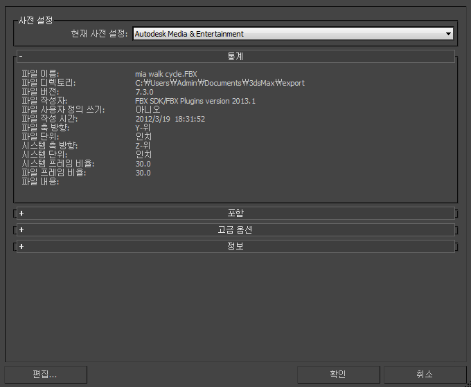 3ds Max FBX plug-in에서는 사용자 정의 사전 설정을 파일에 저장하므로 다른 사용자와 공유할 수 있습니다. 자세한 내용은 사전 설정 저장을 참조하십시오.