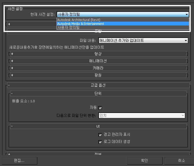 기본 사전 설정은 현재 사용하고 있는 응용 프로그램 버전에 따라 달라집니다. 3ds Max를 사용하는 경우에는 Autodesk Media and Entertainment가 기본 사전 설정이고, Revit을 사용하는 경우에는 Autodesk Architectural(Revit) 사전 설정을 사용합니다.