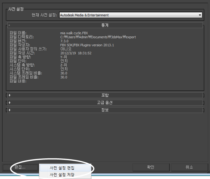 FBX 가져오기 UI의 편집 버튼을 통해 사전 설정 편집/저장 옵션에 액세스합니다.