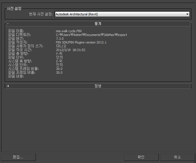 Autodesk Architectural(Revit) 사전 설정은 간단한 FBX UI 버전입니다. 이 사전 설정에는 Autodesk Revit 응용 프로그램의 데이터를 Autodesk 3ds Max로 변환하는 아키텍처 작업 흐름에 가장 적합한 설정이 있습니다. 이 사전 설정에서는 옵션이 표시되지 않으며 사전 설정과 통계 섹션만 표시됩니다. 이 사전 설정에는 Revit에서 3ds Max로의 작업 흐름에 필요한 기본 설정이 모두 들어 있지만 필요한 다른 모든 설정이 포함되도록 사전 설정을 편집할 수 있습니다. 사전 설정 편집/저장을 참조하십시오.
