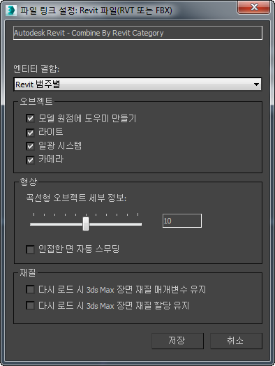 3ds Max에서는 다음과 같은 Revit 및 FBX 엔티티 결합 옵션을 제공합니다.