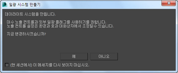 RVT 또는 FBX 파일에서 일광 시스템을 링크하면 파일 링크 관리자가 노출 컨트롤을 설정하라는 메시지를 표시합니다. 이것은 스캔라인 렌더러의 대수 노출 컨트롤 또는 mental ray, iray, Quicksilver와 같은 다른 시각 렌더러의 mr 사진 노출 컨트롤입니다. 예를 클릭하는 것이 좋습니다. 그렇지 않으면 렌더링이 과도하게 노출됩니다.