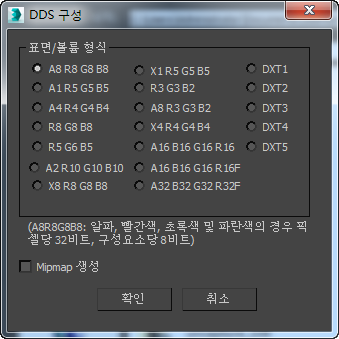 DDS가 출력 형식으로 선택되면, 출력 파일 렌더링 대화상자에서 렌더 또는 설정을 클릭하여 DDS 구성 대화상자를 나타냅니다.
