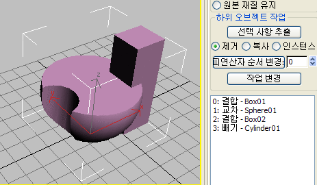 매개변수 롤아웃 아래에 있는 계층 뷰에는 선택된 메시를 정의하는 부울 연산의 전체 리스트가 표시됩니다. 새로운 부울 연산이 수행될 때마다 3ds Max에서 리스트에 항목을 추가합니다.