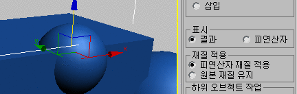 그 결과 구형과 상자가 교차, 다시 말해 두 오브젝트가 차지하는 공통 볼륨을 나타내는 단일 오브젝트가 만들어집니다. 이 경우에는 구형과 상자의 오버랩입니다. 이 시점에는 둘 다 재질을 가지지 않지만 결과물은 3ds Max에서 지정한 원래의 기본 색상을 상자가 만들어질 때 해당 상자에 임의로 적용합니다.