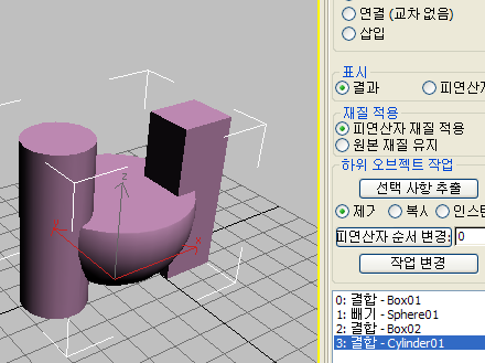 연산을 변경한 결과 원통이 부울 오브젝트에 감산 볼륨이 아닌 추가 볼륨으로 나타납니다. 또한 리스트에서 해당 항목이 “결합 - Cylinder01”로 변경되어 원통에 대한 부울 연산이 이제 결합임을 표시합니다.