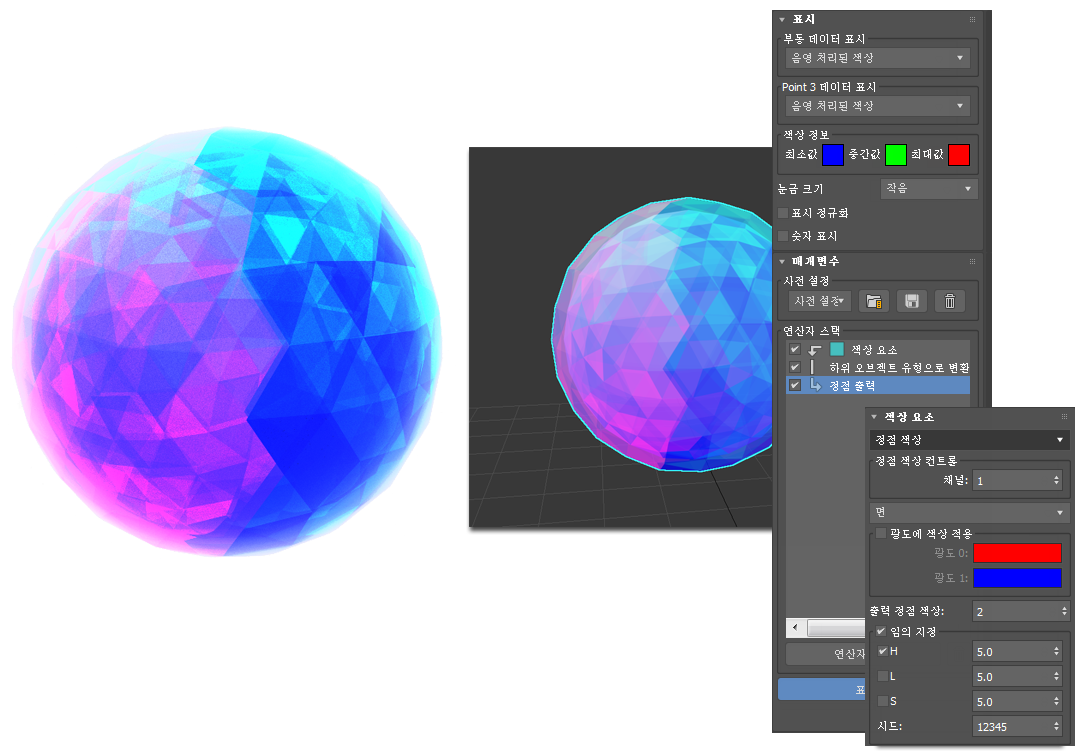 정점 색상 출력을 사용하여 재질의 기본 재질과 투명성을 표시하는 동안 색상 요소 연산자는 지표면의 각 면에 대해 색상을 임의로 지정합니다.