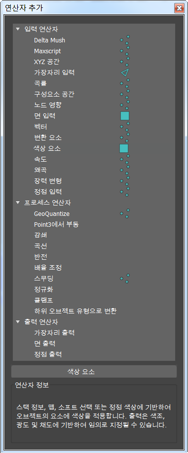 연산자 추가 대화상자를 사용하여 입력, 프로세스 및 출력 연산자를 스택에 추가합니다.