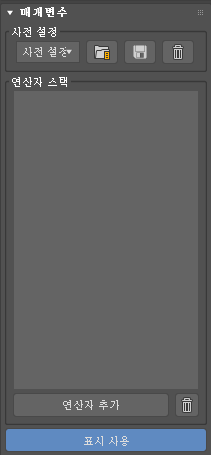 매개변수 롤아웃을 사용하여 연산자를 추가하고, 사전 설정을 저장 및 로드하고, 데이터의 시각적 표시를 뷰포트에서 활성화합니다.