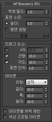 - 모션 방향에서 파티클의 횡단면 영역에 비례한 드래그 값입니다. 동일한 표면 단위 값이 지정되므로 일반적으로 작은 파티클이 큰 파티클보다 드래그가 덜 발생합니다.