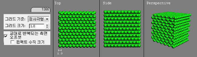 - 단일 그리드 레이어에서 사각형 또는 삼각형 레이아웃으로 파티클을 압축하는 방법을 선택합니다. 두 가지 선택 사항은 다음 그림의 위에서 보이는 대로 표시됩니다.