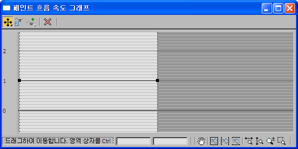 페인트 흐름 속도 그래프는 파티클 페인트 도우미의 설정 롤아웃에서 속도 버튼을 클릭할 때 나타납니다. 이 그래프를 사용하여 단일 스트로크 시간 동안 파티클 페인트 속도를 애니메이션할 수 있습니다.