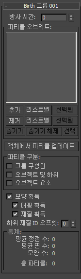 5. Birth 그룹 롤아웃에서 파티클 오브젝트 리스트 바로 아래에 있는 맨 위의 선택됨 버튼을 클릭합니다.