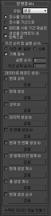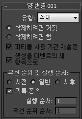 - 이 유형은 양 변경에서 파티클을 만들지(생성) 또는 삭제할지 여부를 결정합니다. 유형이 삭제로 설정된 경우 사용할 수 있는 유일한 컨트롤은 삭제하려면 False/삭제하려면 True 및 실행 순서입니다. 기본값은 생성입니다.
