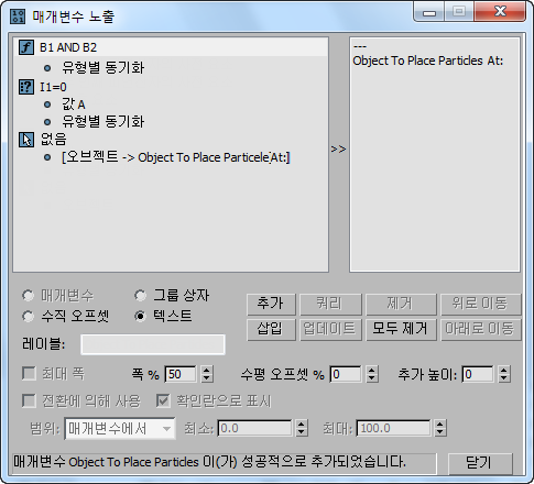 - 매개변수를 노출합니다. 지정된 설정을 사용하여 왼쪽 열에서 강조 표시된 매개변수를 오른쪽 열의 리스트 끝과 매개변수 패널에 배치하려면 추가를 클릭합니다.