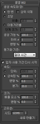 이 설정을 사용하여 파티클이 생성되는 빈도, 사용할 측정 시스템 및 생성되는 파티클 수와 관련된 기타 값을 지정할 수 있습니다.