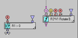 데이터 입력은 왼쪽 측면에서 시작하여 하위 연산자 맨 위에 나타납니다. 각 입력은 롤아웃의 해당 매개변수에 해당하는 번호가 매겨지며 데이터 유형과 관련하여 문자와 색상의 두 가지로 표시됩니다. 예를 들어 벡터 데이터에 대한 입력은 보라색이고 쿼터니언 데이터에 대한 입력은 노란색입니다. 데이터 유형 및 해당 색상 코드에 전체 리스트는 데이터 유형을 참조하십시오.