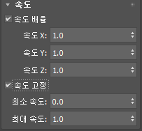 - 파티클 속도의 X, Y, Z 구성요소에 적용되는 배율 요소를 제어하는 속도 배율을 사용하도록 설정합니다. 값이 1.0보다 크면 속도가 매우 빨라질 수 있으므로 속도 배율을 사용할 때 속도를 고정해야 할 수 있습니다.