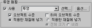 투영 매핑 그룹에서 사용을 켠 다음 이 특정 모델에는 하위 선택 항목이 없으므로 하위 오브젝트 수준을 끕니다.