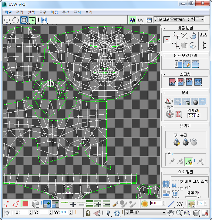 3ds Max에 UVW 편집 대화상자가 열려 UVW 둘러싸기 해제 수정자가 대상 오브젝트에 적용된 방식 및 텍스처 좌표가 모델의 표면에 매핑된 방식을 보여 줍니다. 이 레이아웃은 페인팅을 돕기 위해 설계되었으며, 텍스처 매핑을 "손질"하는 데 필요할 수 있습니다.