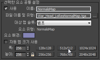 대상 맵 슬롯 드롭다운 리스트에서 범프를 선택한 다음 512 x 512 폭/높이 버튼을 클릭합니다. 그러면 출력 크기가 512 x 512픽셀로 설정됩니다.
