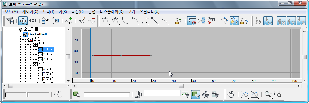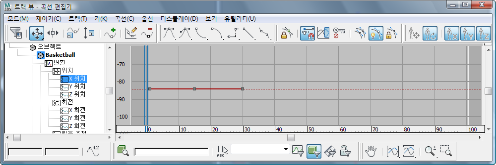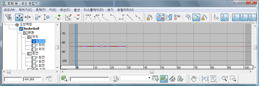 제어기 창에서 X 위치 트랙을 클릭하여 해당 트랙의 곡선을 표시합니다.