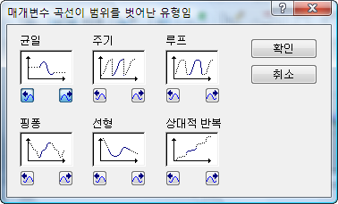 이 대화상자에는 사용자가 만든 키 범위를 벗어나는 애니메이션 부분을 계속하는 방법을 지정할 수 있는 여러 옵션이 있습니다. 각 옵션은 그래픽 버튼으로 표시됩니다. 그래픽에서 원본 애니메이션은 실선 추적으로 표시되며 애니메이션을 계속하는 효과는 점선 추적으로 표시됩니다.