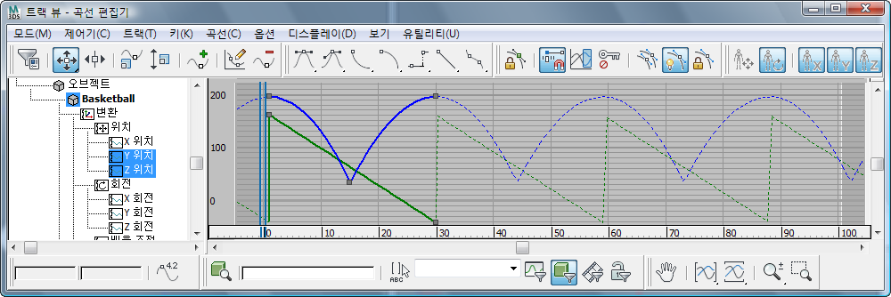 제어기 창에서 Z 위치 트랙을 클릭한 다음 Ctrl 키를 누른 상태로 Y 위치 트랙을 클릭하면 두 곡선이 모두 표시됩니다.