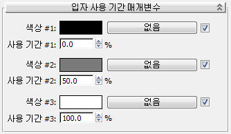 파티클 사용 기간 맵에서는 세 가지 색상이 지정됩니다. 기본적으로 색상 #1은 파티클 생성 시(0%)의 색상이고, 색상 #2는 파티클 수명이 절반 지났을 때(50%)의 색상이며, 색상 #3은 파티클 소멸 시(100%)의 색상입니다. 사용 기간을 변경할 수는 있지만 이 자습서에서는 변경하지 않습니다.