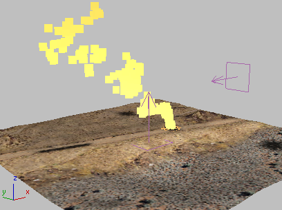 뷰포트에서 파티클은 이전에 생성했던 작은 큐브보다 큰 정사각형 모양으로 변경됩니다. 그러나 파티클 방향이 아직 어디로도 지정되지 않았으므로 방향이 임의로 지정됩니다.