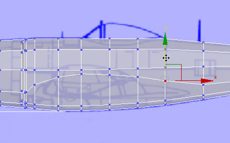 팁: 이때 날개의 위쪽 표면이 너무 낮게 보이면 (정점) 하위 오브젝트 수준으로 이동하여 (가장자리로 제약)을 활성화하고 을 사용해 날개의 위쪽 가장자리 기준을 따르는 정점을 기체를 따라 위쪽으로 이동합니다. 이러한 정점은 투시 뷰포트에서 가장 쉽게 선택할 수 있습니다. 작업이 완료되면 (없음으로 제약)을 활성화해야 합니다.