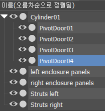 리스트에 이렇게 표시되지 않으면 Cylinder01의 하위로 나타나지 않는 문을 허브에 다시 링크합니다.