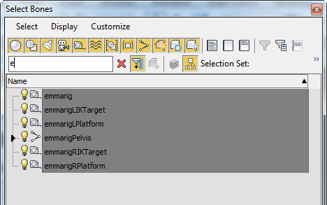 - 머리카락, 모자, 눈을 제외한 모든 리스트 항목을 강조 표시합니다. 원하는 골격이 모두 "Emma"로 시작되므로, 찾기 필드에 e를 입력하기만 하면 이 작업을 가장 쉽게 수행할 수 있습니다. 선택을 클릭하여 종료합니다.