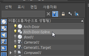 이제 스플라인이 Arch-Door 오브젝트의 중심에 제대로 배치되고, 벽돌 재질을 매핑하는 데 가이드로 사용할 준비가 완료되었습니다.