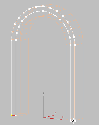 아치 오브젝트가 매핑의 윤곽과 횡단면을 표시하는 케이지 기즈모로 둘러싸입니다.