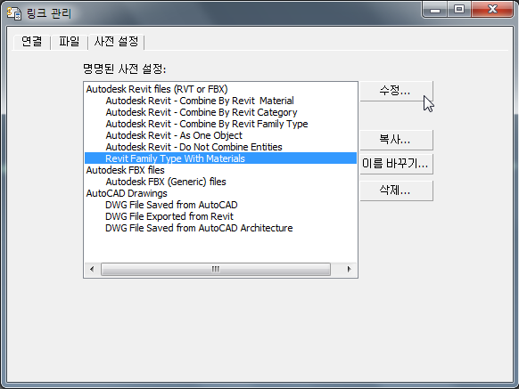 사전 설정 탭에는 RVT, FBX 또는 DWG 파일을 링크하는 여러 가지 사전 설정이 나열됩니다. 주 연결 탭의 사전 설정 드롭다운 리스트에서 사전 설정을 선택할 수 있습니다. 사전 설정 탭을 사용하여 사전 설정을 편집하거나 새 사전 설정을 추가합니다.