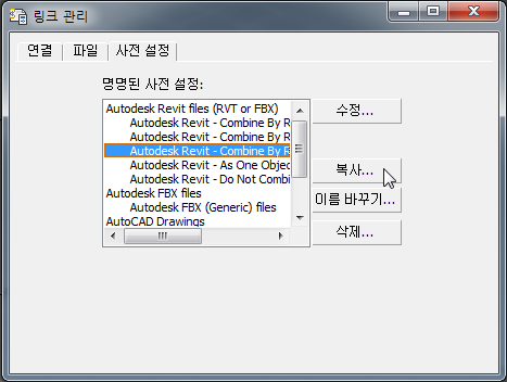 6. 사전 설정 탭에서 Autodesk Revit - Combine By Revit Family Type 항목을 클릭하여 강조 표시한 다음 복사를 클릭합니다.