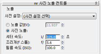 7. "mr 사진 노출 컨트롤" 롤아웃 노출 그룹에서 셔터 속도 값을 125.0(1/125초)으로 변경합니다.