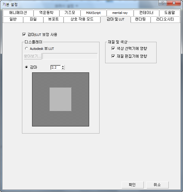 5. 3ds Max에 기본 설정 대화상자가 열리고 감마 및 LUT 탭이 표시됩니다. 감마/LUT 보정 사용을 켭니다. 감마가 선택되어 있는지, 감마 값이 2.2로 설정되어 있는지 확인합니다.