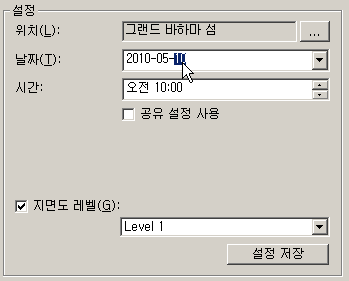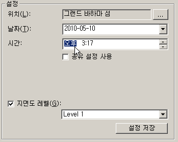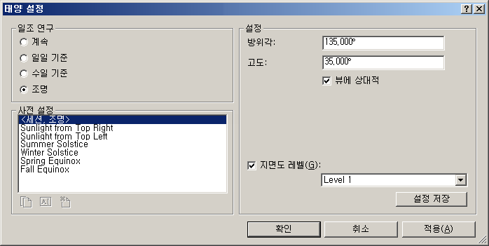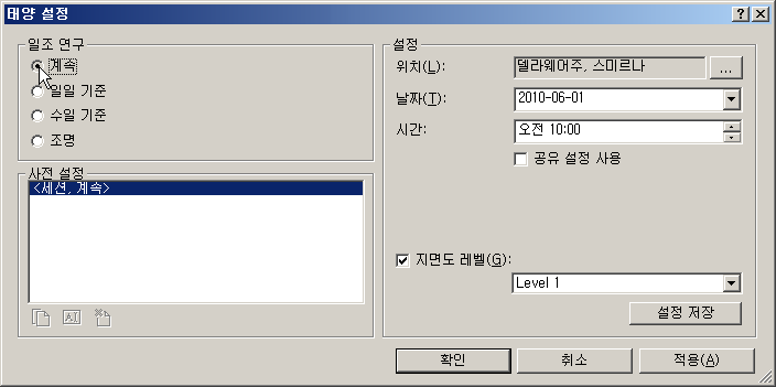Revit에 태양 설정 대화상자가 열립니다. 이 대화상자에서 일광 시스템에서 만든 태양의 위치에 대해 지리적 위치와 하루 중 시간을 설정합니다.