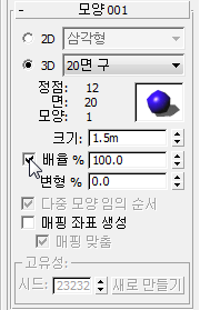 - 모양 롤아웃에서 3D를 선택한 상태로 두고 3D 드롭다운 리스트에서 20면 구를 선택합니다.