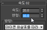 - 속도 롤아웃에서 속도 값을 20.0으로, 변형 값을 10.0으로 변경합니다.