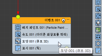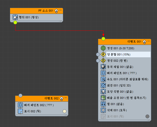 이벤트 002에서는 파티클 페인트 002를 불씨 파티클 생성용 소스로 사용합니다.