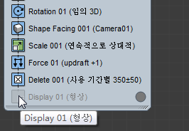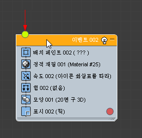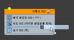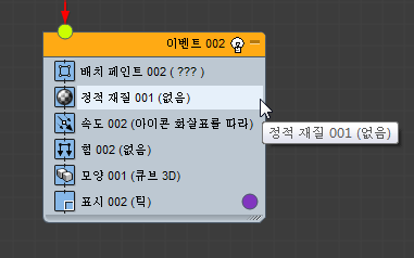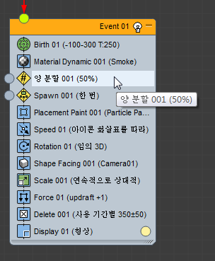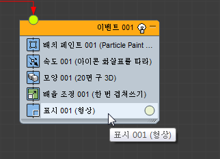 이벤트(연산자, 테스트 등)를 이벤트 표시의 빈 부분에 드롭하면 파티클 흐름에서 새 이벤트를 만듭니다. 초기에 새 이벤트에는 드롭한 연산자와 표시 연산자가 포함됩니다.